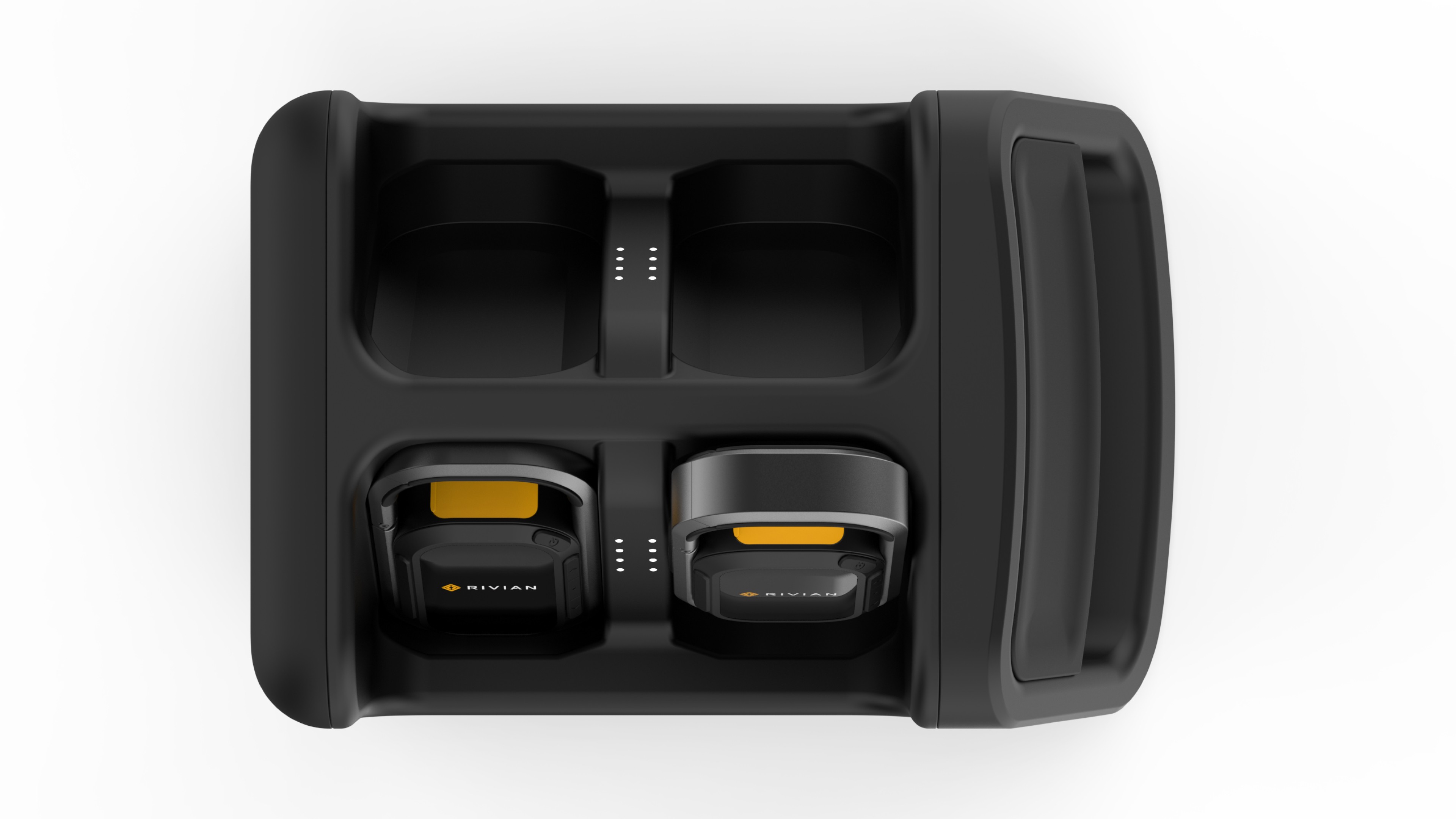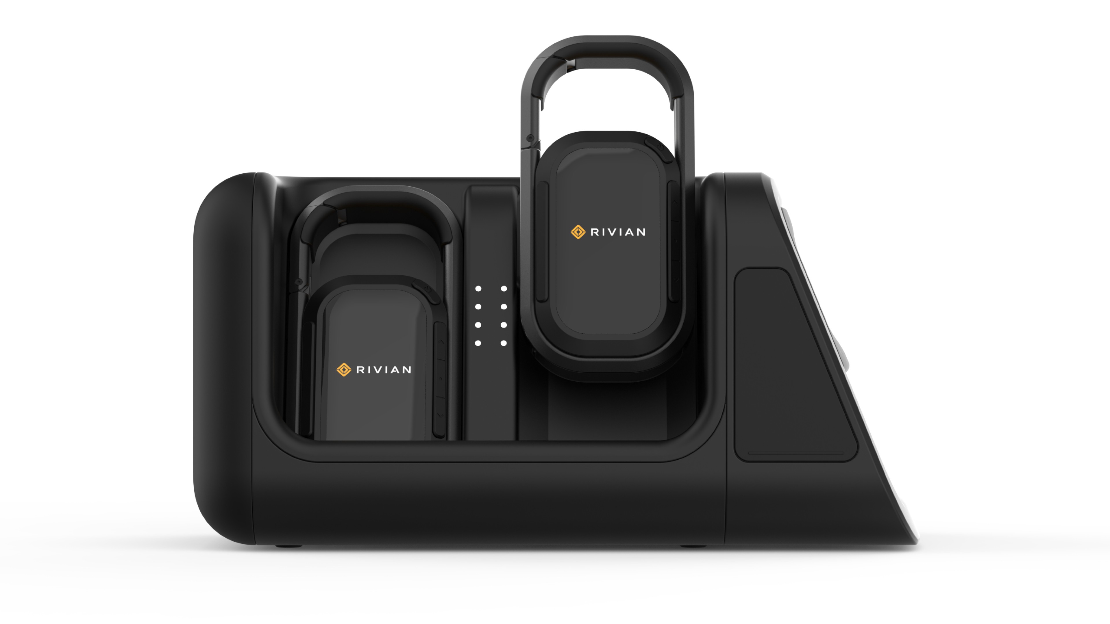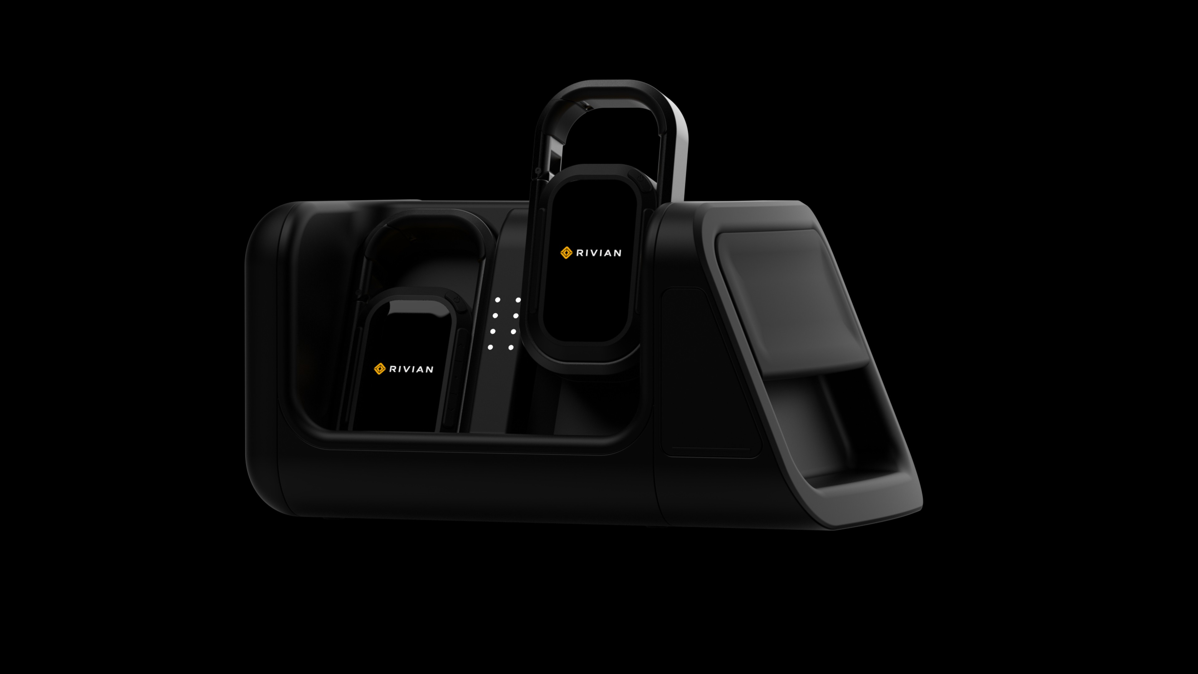 The Rivian Off-Road Communication Hub features a custom docking station that fits seamlessly into the speaker slot, keeping rugged, weatherproof two-way radios charged and ready. Designed for off-roaders, it provides a dedicated communication network independent of cell service, with hands-free operation for easy use while driving or exploring. Built for durability, long battery life, and seamless group communication, it enhances safety and coordination on any adventure.